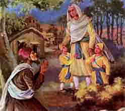 After an arduous journey Mata Gujri Ji along with the two Sahibzadas, reached the hut of a Muslim water carrier, Kuma. On seeing Mataji he rushed out and, with folded hands, requested Mataji to bless his humble cottage by staying therein. Mataji was pleased with his devotion. Since it was getting dark, she decided to halt there for the night. |