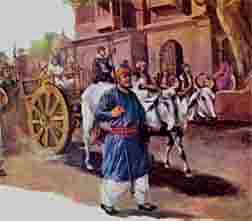 Early next morning they were taken in a bullock cart to Bassi Police Station. News of their arrest had spread far and wide. Large crowds collected everywhere on the way. People were surprised that the young innocent boys had been put under arrest along with their venerable grand mother. The fearless looks of the Sahibzadas aroused their admiration and they observed, They are the brave sons of their brave father. .The remarks of the on-lookers made the constables panicky and they started walking fast. The cart-driver also whipped the bullocks so that they could reach Sirhind quickly. |