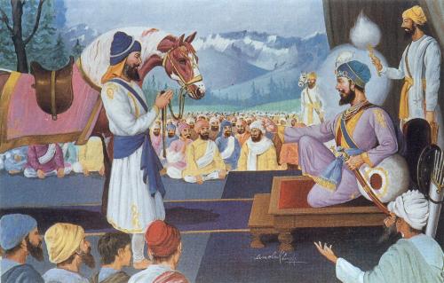 Bidhi Chand examined the place, visited the stable and caressed Dilbagh who responded by low neighing. Then he sat in meditation. After a time he said he would ride the horse in the compoud to see if it could jump up as high as the fort wall. Just at that very place he kicked the horse and it plunged into the river over it. He made for the Guru and produced it before him at village Kangar in Malwa. The Guru was highly delighted and observed.