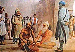 Dayal Das was the eldest brother of Bhai Mani Singh. He was one of the five companions of Guru Tegh Bahadur before his execution at Delhi. First of all Bhai Mati Das was asked to become a Musalman. He boldly pleaded for his own religion as being the best. He was at once tied between two posts, and while standing erect was sawn across from head to loins. Dayal Das condemned the Emperor and his courtiers for this inhuman act. He was immediately tied up like a bundle, thrown into a huge cauldron of boiling oil and roasted alive into a block of charcoal.