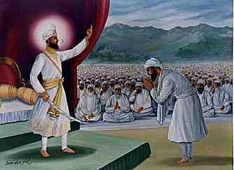 | Guru Gobind Singh Ji, at Fatehgarh Sahib asking for a head. Here he beheaded the Five Piaras and with the ‘Amrit’, he again gave them life – A new Life – A new Spirit infused into the dead concious of the Hindu Dharma. |