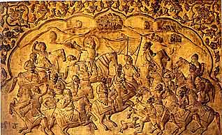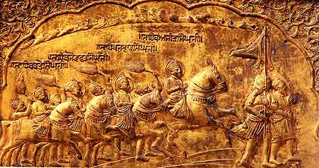 | Guru Ji with his followers- Gilded panels at the Darbar Sahib |