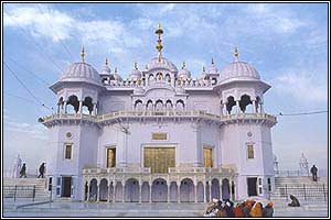 Takht Sri Keshgarh Sahib is the principal shrine at Anandpur. Resplendent in its white marble glory, the shrine stands on a hillock and marks the site of the Kesgarh Fort where the historic Baisakhi congregation of 1699 had taken place. The present complex was constructed during 1936-44 under the su-pervision of Sant Hari Singh Kaharpuri. Being on a slope, the complex has two levels protected by retaining walls on the sides. On the lower level, approached by a flight of steps is the imposing two-storeyed gateway, offices, and a 30-metre square courtyard. The level on which stands the main building is 2.5 metres higher than the courtyard. The 16-metre square hall with a balcony in front contains within it the sanctum, a 5.5-metre square room in which some old weapons preserved as sacred relics from the time of Guru Gobind Singh are displayed on a low platform. The Guru Granth Sahib is seated under a canopy outside the sanctum, above which rises a fluted lotus dome topped by a tall ornamental pinnacle of gilded metal, and a gilded khanda as a fmial. On the roof, corners of the hall and the balcony are adorned with domed kiosks. Guru ka Langar is on the lower level behind the central building. The lower slopes of the Kesgarh hill are covered with rows of residential rooms for staff and pilgrims. This complex is collectively known as Dashmesh Nivas. A 55-metre square divan hall, about 150 metres east of the central building, was added dur-ing the 1980’s to cater for large congrega-tions on festival occasions. A sarovaror bathing tank, 80-metre square, in a walled com-pound is situated at ground level to the west of the Takht Sahib and close to the Ropar-Nangal road. The relics placed in the inner sanctum of Takht Sri Kesgarh Sahib include a khanda, a katar (dagger), a saif (double-edged straight tapering sword), a muzzle-loading musket, a spear known as karpa barchha, and a nagani (a kind of spear with a twisted and pointed blade). Another set of weapons also believed to have once belonged to Guru Gobind Singh, which had been taken away by the British to England after the oc-cupation of the Punjab in 1849 and which had been brought back from there at the time of the celebration of the 300th birth anniversary of Guru Gobind Singh in 1966-67 are now on display here.