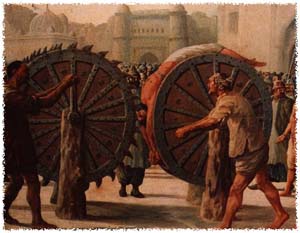 Both Bhai Subeg Singh and Shahbaz Singh were tied on separate set of wheels opposite each other. The wheels were operated and the steel blades started ripping the flesh of the two brave Sikhs of Guru Going Singh. Blood started flowing all over their bodies and wheels.