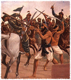 “If you are really brave come forward for one to one combat for testing acts of bravery to-day.” Jalaluddin ordered two of its soldiers to take on the two Sikhs. No sooner had the two soldiers stepped forward Bhai Bota Singh and Garja Singh attacked them with electrifying speed and beat them to death with their sticks. Jalaluddin sent forward another two soldiers who too were dispatched to hell by the brave Sikhs. In a similar fashion General Jalaluddin lost eight of his soldiers. Just then, the Sikhs shouted “Now send four soldiers at a time to fight two to one with us.” Three batches of four soldiers each were done to death by the smart and brave well trained Sikhs.