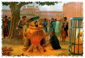 While Bhai Dayala satrted reciting Gurbani the water started boiling in the cauldrum. Kazi continued to persuade Bhai Ji to save his precious life by accepting conversion to Islam. Bhai Dayala paid no heed to it and kept meditating on the name of God, with grace of his Guru, who was witnessing from his cage his devout disciple was laying down his life in the most courageous and peaceful manner unmindful of the brutal manner, the tryants were doing him to death. Boils appeared on the entire body of Bhai Dayala and the spectators were terrified by the most inhuman scene. But Bhai Ji had before his eyes the model of martyrdom of the Guru Arjan Dev Ji, who was done to death under the orders of Emperor Jahangir in a similar but much worse manner.