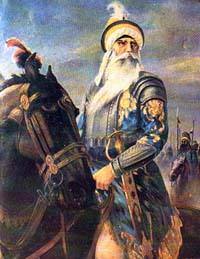 One time, when Kapoor Singh went to Amritsar, he had to fight with Kazi Rehman. He had declared that Sikhs, the so-called lions, would not dare to come to Amritsar and face him. In the ensuing fight Kazi was killed. When his son tried to save him, he too lost his life. Later, Massa Rangar took over the control of Amritsar. While smoking and drinking in the Harimandar Sahib, he watched the dances of the nautch girls. The Sikhs who had moved to Bikaner, a desert region, for safety, were outraged to hear of this desecration. Bhai Sukha Singh and Mehtab Singh, went there disguised as revenue collectors. They tied their horses outside, walked straight into the Harimandar Sahib, cut off his head, and took it with them. It was a lesson for the rulers that no tyrant would go unpunished.