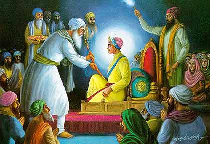 | Baba Budha Ji handing over the Gurgaddi to the young Hargobind. Here he also adorned him with two sword – one of Miri and the other of Piri. |