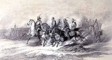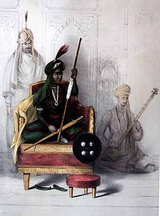 | Thus we have Emily Eden mentioning that Sher Singh was inviting himself too often to her dinners with his son Pratap Singh with eyes as big as saucers, and emeralds bigger than his eyes, and Allard with his great black and white beard resembled a piebald horse. She found Gulab Singh to be quite horrid though his brother Dhian Singh was uncommonly good looking and Lal Singh, Rani Jindan’s paramour, was sensually built. Vigne easily saw through Dhian Singh’s sham display of trying to throw himself in Maharaja Ranjit Singh’s funeral pyre (he would have been greatly disappointed if he had not been prevented from doing so). From a cheeky account we learn of how a ‘wretched’ painting of Maharaja Ranjit Singh was sought to be presented to the Queen along with rich Kashmiri gifts, and that the chief painter in the Lahore court is certainly not a Raphael. Vivid descriptions of scenes at Maharaja Ranjit Singh’s parties are given where liquor and wine flowed freely. Many, like Barr, could not comprehend with their European sensibilities the Indian form and perspective of painting. This brash young lieutenant escorted Col. C.M. Wade on his mission to Afghanistan and, en route, visiting the Lahore court he wrote: We were admitted through a low archway beneath the throne to a small court, and close to a building which contains the regal entrance to the hall of justice. The exterior of this is covered with paintings in oil of a very extravagant description, and evidently of late construction, as one subject represents the interview of the Maharajah with Lord William Bentinck at Roopur. The parties are supposed by the artist to be assembled in the audience tent, the Sikhs being arranged on one side and the British on the other. The two great potentates occupy the center of the scene, and Lady William, accoutered in white trousers, boots, and gold straps, is seated a few paces behind her husband. An uglier set of vagabonds than the man of daubs has made of our countrymen cannot well be conceived; though the people who accompanied us regarded them as likenesses, and were eager to point out Macnaghten Sahib, the Bakhshee Sahib’, and others, who have only to see their portraits to be grateful. We were subsequently shown into what may in truth be termed the Painted Chamber, as it is adorned with pictures of battles in which the two Generals (Allard and Ventura) were engaged, and executed on the chunam walls by native artists. The perspective of these scenes is most ridiculous; and at the siege of Moultan the cannons are turned up on end to enable the gunners to load them, the figures overtop the fortification, and the cavalry seem to be maneuvering in the air; and absurdities of a similar nature are perpetrated throughout them all, and no doubt afford much amusement to their gallant owners, whose policy has led them this far to assimilate their dwellings with those of the native population; for it can hardly be supposed their taste is so far vitiated as to regard these embellishments as ornamental. Barr did not spare even Lord Krishna and his comments are amusing! Crishna’s exploits occasionally partake of the ludicrous and disgusting. In one compartment he is portrayed with a milkmaid shampooing his great toe; in another, he is perched up in a tree, from the branches of which depend various articles of dress he has stolen from some fair damsels who are refreshing themselves in a limpid stream below, and whose heads and hands, clasped in a suplicatory manner, appear above water beseeching him to return their apparel, but to no purpose, as he is only laughing at their distress. In a third, he is dashing out the brains of a man with his club; and in a fourth, tearing out the entrails of a prostrate foe with the most brutal ferocity. It needed the sensitivity of a scholar like E.B. Havell to appreciate the subtleties of Sikh miniature painting. In his book ‘Indian Sculpture and Painting (1908)’, describing a painting (done during the period of Sikh influence) showing Mian Jai Singh of Guler hearing musicians, he wrote, Like the pure melody of an old folk-song, it is a true creation of national sentiment, of the poetic impulse which flows spontaneously from the heart of a people inspired by the joy of life and love of beauty. Here we have the ‘sunshine of sunshine’ given with pure delight with which the lark trills his song of joy in the high heavens on a summer morning. The figures in the picture are by no means attractive types or very deeply studied as to character; but their flowing draperies and the gay colours of the musical instruments, together with the pearly whiteness of the marble and the bright hues of the flowers, serve the purpose of the artist – to express the beauty and gladness of the radiant Indian sunlight. There were also Britishers like Macauliffe, who left his comfortable career in the Indian Civil Service to translate the religious texts of the Sikhs, a job which he did admirably well and ran up a debt doing so. Overall these are interesting accounts which help in giving a perspective to the characters painted in the miniatures as well as the later lithographs and paintings. Once these personalities are understood the images of that period seem to spring to life, and the series become like pages from one big family album of Maharaja Ranjit Singh. Even certain nuances at the court of Lahore seem obvious, like Maharaja Ranjit Singh having to periodically restrain Sher Singh from becoming too close to British guests and influences. It was also ironical that the real son of Maharaja Ranjit Singh, Kharak Singh, was no match compared to his great stature, was an opium addict, and did not receive good mentions by chroniclers. Even in paintings he does not stand out as a personality of significance. | |
