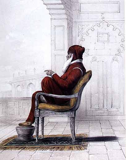 Vigne, a geologist, sketched Maharaja Ranjit Singh and wrote about him, The diminutive size of his person, and the comparative simplicity of his attire -consisting of a turban, usually large only over the forehead, with the end hanging down the back, folded a la Sikh; a kind of frock or tunic, padded so as to give an extraordinary breadth to his naturally wide shoulders; the kumerbund tied round his waist; and pair of close-fitting trousers, of the same colour, yellow or pea-green; and all of Kashmirian manufacture – did not prevent anyone, who entered the durbar for the first time, from instantly recognizing the Maharajah. The contour of his face was square; his complexion was a light olive, his forehead was wide and Napoleonlike: his right and only eye, large and prominent, for he had lost the other by the smallpox, with which he was slightly marked, was incessantly roving; his nostrils expanded and contracted, as his conversation became animated; and decision and energy were pre-eminently imprinted on his thick but well-formed lips. A grey moustache, blending with his white beard, added character to the very expressive countenance of this extraordinary man. Baron HugeL an Austrian traveller, also visited Ranjit Singh’s court during his later years, when he was partially paralysed. I must call him the most ugly and unprepossessing man I saw throughout the Punjab. His left eye, which is quite closed, disfigures him less than the other, which is always rolling about, wide open, and is much distorted by disease. The scars of the smallpox on his face do not run into one another, but form so many dark pits in his greyish-brown skin, his short straight nose is swollen at the tip and his head, which is sunk every much on his broad shoulders, is too large for his height and does not seem to move easily. He has a thick muscular neck, thin arms and legs, the left foot and the left arm dropping, and small well-formed hands. He will sometimes hold a stranger’s hand fast within his own for half an hour, and the nervous irritation of his mind is shown by the continued pressure on one’s fingers. His Costume always contributes to increase his ugliness, being in winter the colour of gamboge. When he seats himself in a common English armchair, with his feet drawn under him, the position is one particularly unfavourable to him; but as soon as he mounts his horse, and with his black shield at his back, puts him on his mettle, his whole form seems animated by the spirit within, and assumes a certain grace, of which nobody could believe it Susceptible. In spite of the paralysis affecting one side, he manages his horse with the greatest ease. If nature has been niggardly to him in respect of personal appearance, she has recompensed him very richly by the power which he exercises over everyone who approaches him. He can in a moment take up a subject of conversation, follow it up closely by questions and answers, which convey other questions in themselves, and these are always so exactly to the purpose, that they put the understanding of his respondent to the teat. With a voice naturally rough and unpleasant, he can assume a tone of much fascination whenever he wishes to flatter; and his influence over the people of northern India amounts to something like enchantment. |