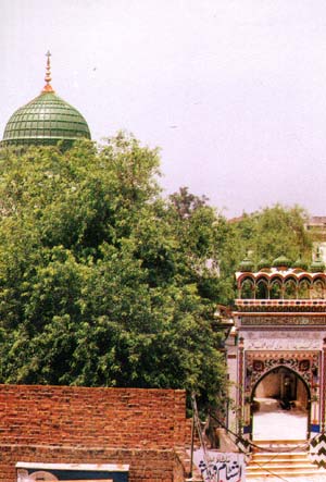 This shrine is behind Lahore District courts. When Baba, Farid ud Din Masood Ganj Sh came to Lahore, he chose this spot for his residence Later the devotees built a raised platform. chaukhandi (room with four doors). was erected over it during the reign of Maharaja Ranjit Sin uch of this structure was razed to ground during the British period when SSP office w established there. All the graves built on the platform were levelled. Only a small portion of platform remained intact. Now an elegant dome is being built over it. A fair was organised annu on the 5th of Moharram which was attended by Muslims, Hindus and Sikhs. Even now the fair organised but the fanfare of the past is gone.